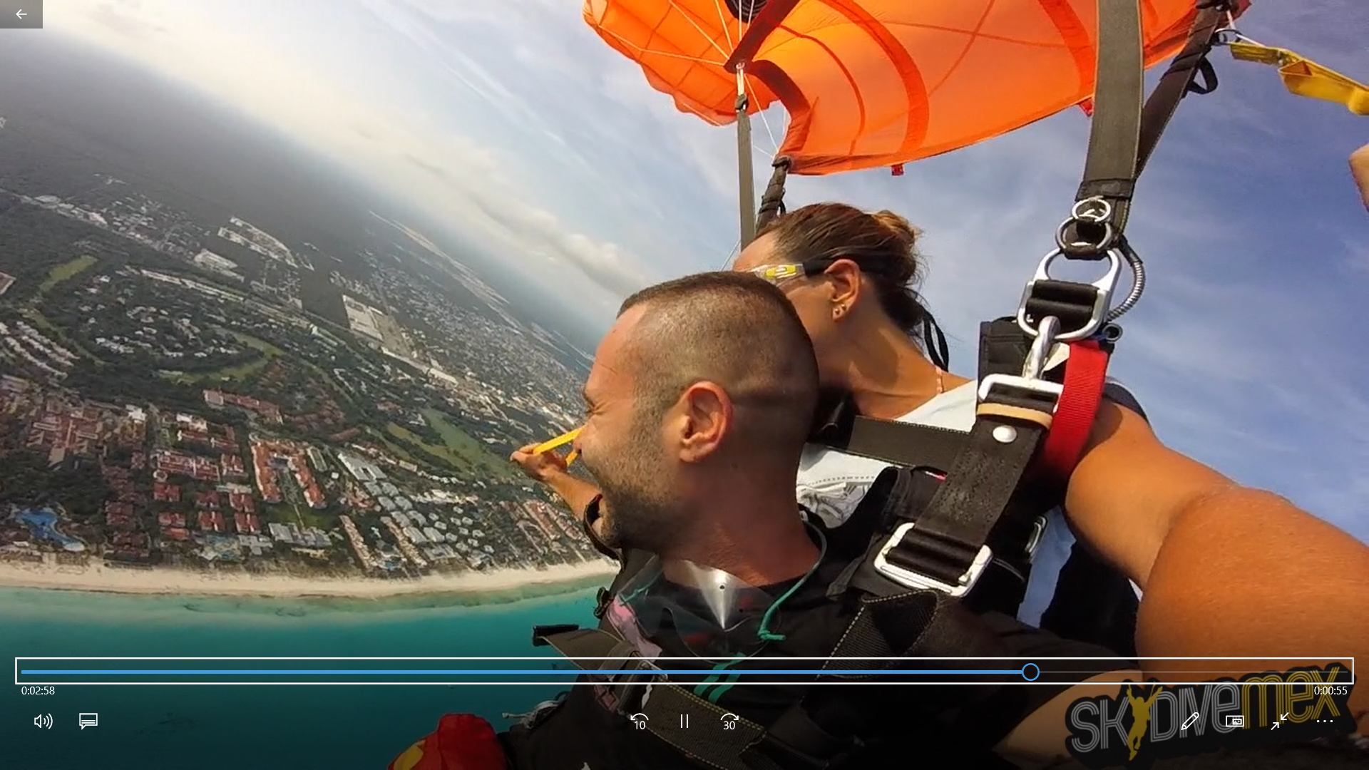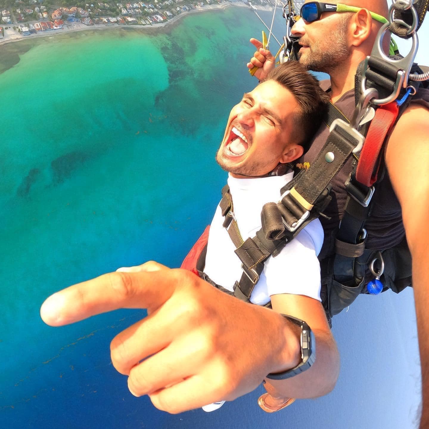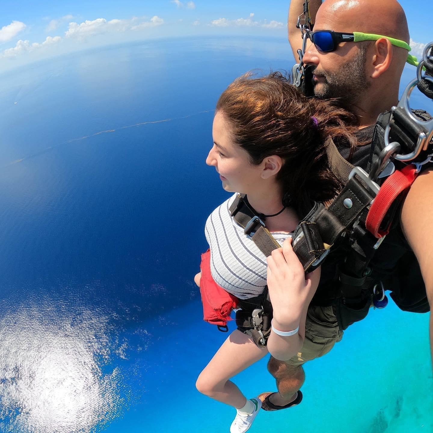 This skydive includes a 40-second free fall from a distance of about 10,000 feet, and an 8-minute hover with a parachute. While hovering, the instructor will assist in guiding the parachute to a soft landing on the beach